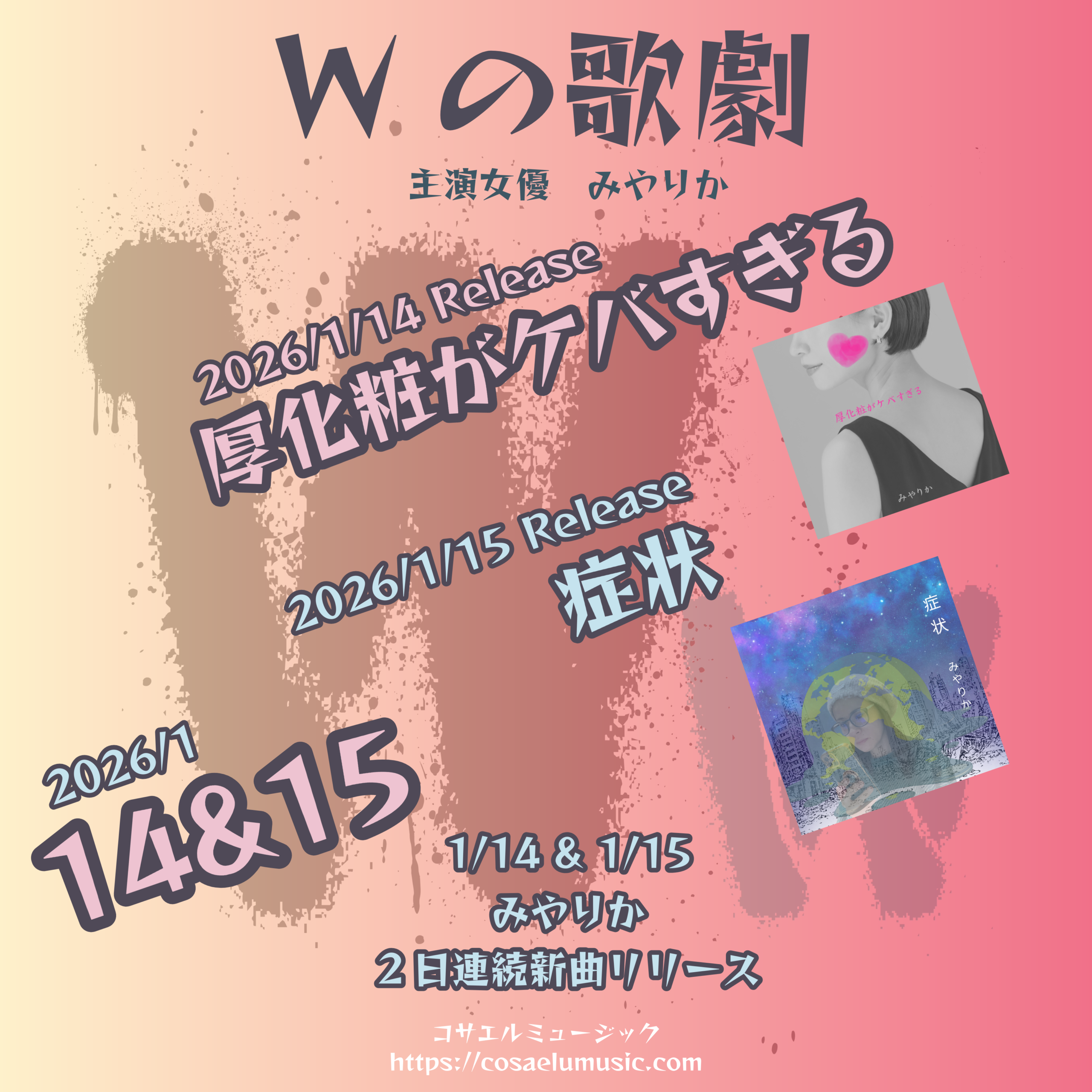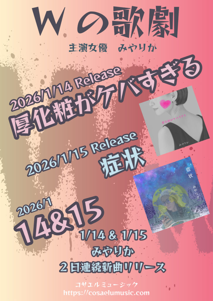「Wの歌劇」主演女優みやりか 2日連続新曲リリース みやりか作品 2026.01.12 2026年、みやりか始動! 一気に2曲新曲リリースします!それも2日連続で! 2026/1/14「厚化粧がケバすぎる」 2026/1/15「症状」 enu-Gがまたenu-Gらしいみやりからしい曲を書きました… 2026年、心の「厚化粧がケバすぎる」みやりかは「海老」を踊り食いして変な「症状」を発してさらにみやりかワールドを厚化粧します! お楽しみに!!