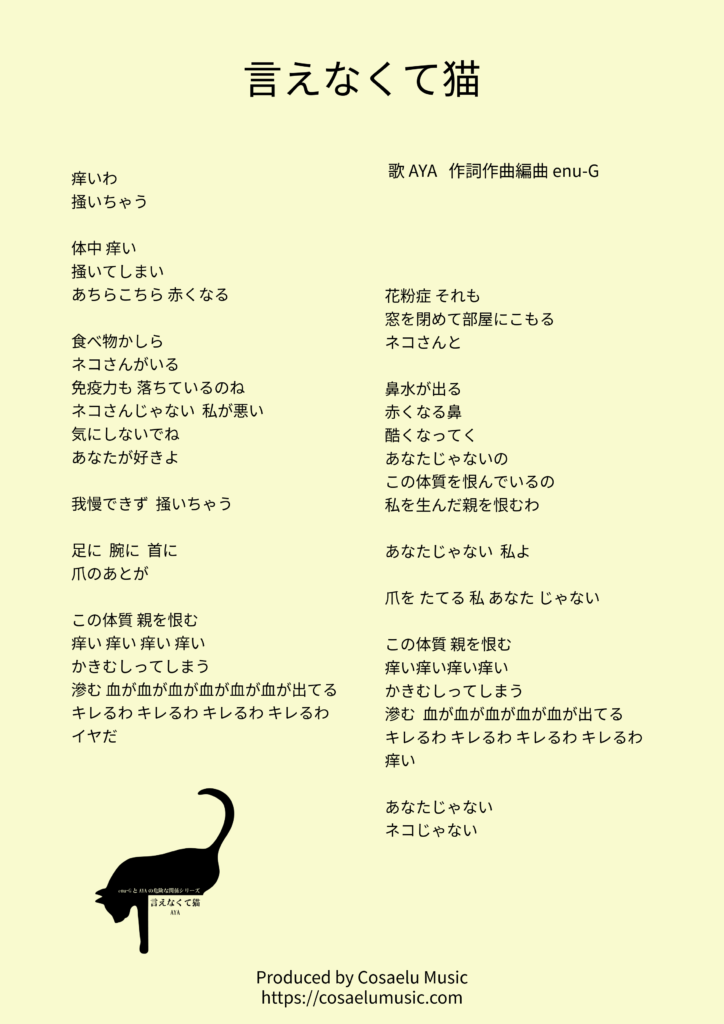 2026/3/6「言えなくて猫」by AYA 配信リリース開始! enu-G とボカロの危険な関係 2026.03.04 ついに”enu-GとAYAの危険な関係”シリーズ第一弾、 「言えなくて猫」 2026/3/6より配信リリース開始されます! 大好きな猫と一緒に住んでいる女の子猫アレルギーなんだけど絶対にそれを認めたくない絶対に猫が原因だち言いたくない そんな気持ちを歌ったのがこ「言えなくて猫」